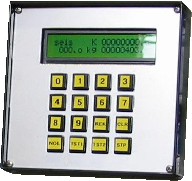 Mikrokontrolleri, 20-char LCD, 16-näpp, 2xRS232, 8 lähtöä, 2 tuloa, eri ohjelmilla: viljavaaka, avokanavavirtausmittari, paternoster-ohjauspääte |