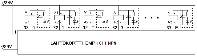 Korttia saa tilauksesta myös NPN-lähtöisenä, jolloin releiden yhteinen ketjutus tulee +/24V puolelle.