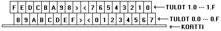 Tulokortissa on 32 tuloa, jotka on numeroitu 0.0 ... 0.F ja 1.0 ... 1.F
