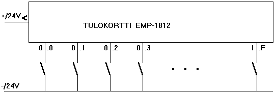 Yhdessä tulokortissa on binäärituloja 32 kpl, jotka toimivat 24VDC nimellisjännitteellä (12V..36V).