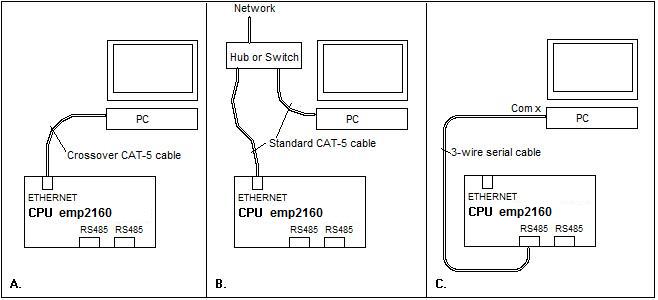 CPU-kortti liitetään Ethernet-liitännällä lähiverkkoon tai suoraan tietokoneeseen. Vaihtoehtoisesti CPU-kortti voidaan liittää PC:n sarjaporttiin. Kummassakin tapauksessa PC:ssä on EmpView-ohjelmisto.