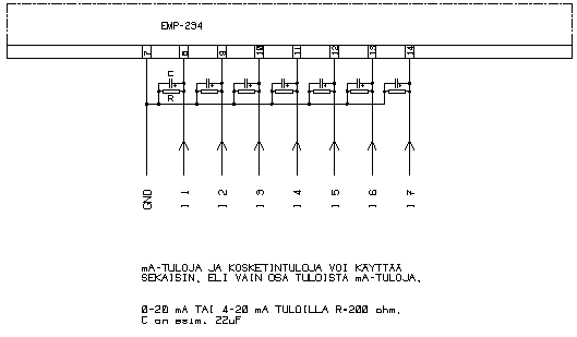 Kosketintulojen sijaan voidaan liittää myös analogiaviestejä. Tulot ovat sähköisesti 0-5 V jännitealueelle, joten 20 mA viestien liittäminen vaatii RC-piirin, jossa R=200 ohmia ja C on esimerkiksi 22uF 16V tantaalikondensaattori.