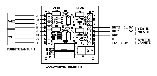 Kuvassa 2-kanavaisen esivahvistimen (vaakavahvistin) liitännät. Jos tarvitaan käyttöön vain yksi kanava, kytketään vain anturi WE1, jolloin saadaan lähtöjännite OUT1. Tai, jos kytketään vain WE2, saadaan lähtöjännite OUT2.