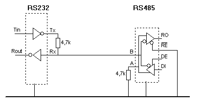 Se saa negatiivisen jännitteen RS232 Tx-nastasta 4,7 kohmin vastuksen kautta. Half duplex-liikenteessähän lähetys ja vastaanotto eivät ole yhtä aikaa aktiivisia ja RS232:n Tx-nasta antaa n.-10V jännitteen, silloin kun se ei lähetä. Ollessaan alhaalla RS485-lähtö sallii lähtöjännitteen menevän myös negatiiviseksi, jos se saa negatiivista "vetoapua" ulkopuolelta.